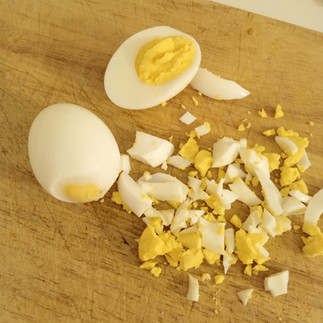 Picar bien finos el ajo y las hojas del perejil, y trocear los huevos hasta obtener pedazos pequeños.